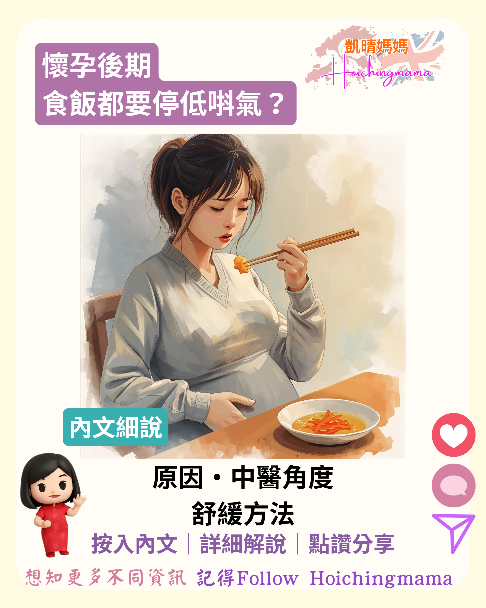 懷孕後期,食飯都唔再係一件輕鬆嘅事。個肚愈來愈高,壓住橫膈膜,肺部空間變窄,一餐飯未食完,就已經要停低深呼吸。加上腸胃運作慢咗,胃氣容易積聚,食多啲就會覺得「頂住晒」,唞氣自然唔順。