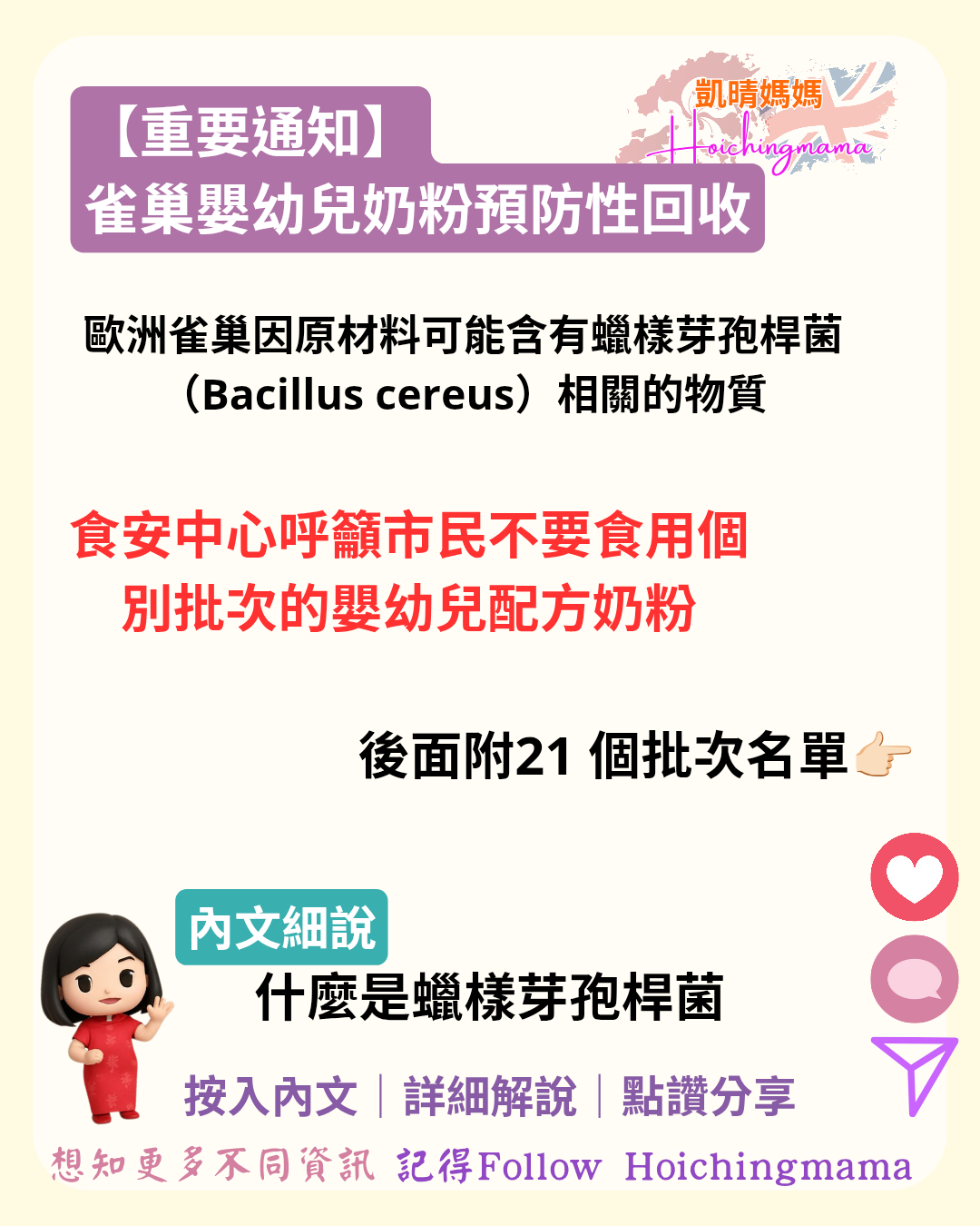 近日歐洲雀巢因原材料可能含有與蠟樣芽孢桿菌(Bacillus cereus)相關的物質,正進行預防性回收。香港食物安全中心已即時跟進,而雀巢香港亦宣布: