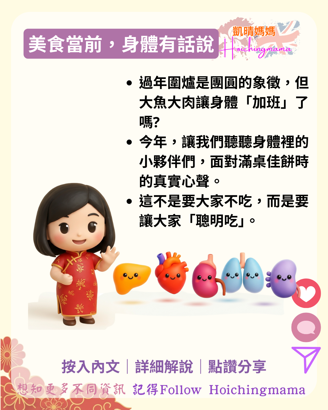 過年圍爐是團圓的象徵,但大魚大肉可能會讓身體「加班」。今年,讓我們聽聽身體裡各個小夥伴的心聲,學會「聰明吃」,讓節日過得開心又健康。