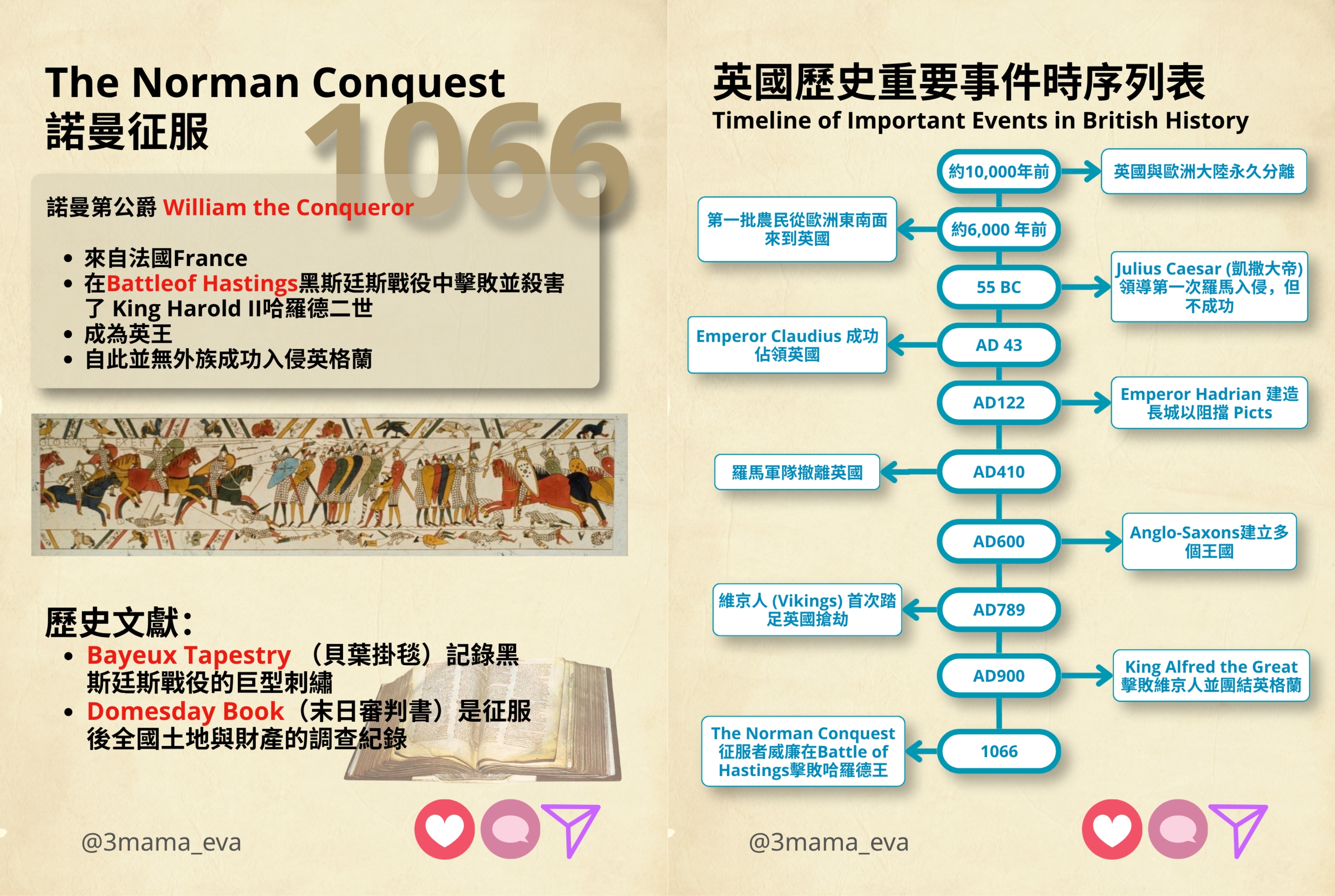 🔸歷史來到最關鍵的一年——1066 年。來自法國的征服者威廉 (William the Conqueror) 在黑斯廷斯戰役 (Battle of Hastings) 中擊敗並殺害了哈羅德王。這是英國歷史上最後一次成功的外族入侵。威廉非常細心,他用左20年時間派人查遍全英,把誰家有多少人、多少地、甚至多少頭豬都記在《末日審判書》(Domesday Book)裡。呢本書喺1086年正式完成。