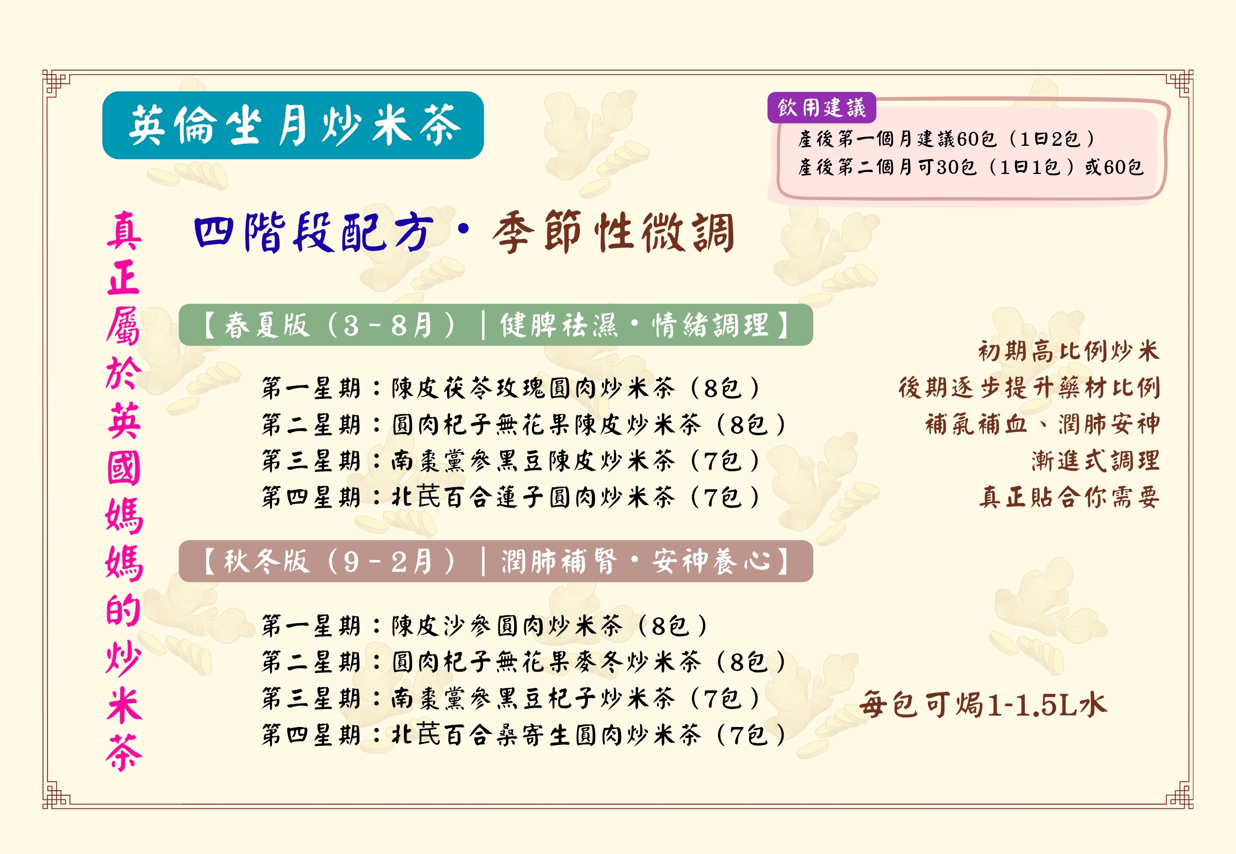 ✅ 湯包獨立包裝,一次一包,簡單易用✅ 炒米茶已入茶袋,每次1包,小包包裝✅ 所有產品附詳細使用方法,無需經驗都煲得好✅ 精選醫藥級藥材,包含冬蟲草、阿膠、石斛、南棗、瑤柱、螺片等珍貴材料✅ 不含開刀禁用藥材,順產或開刀都適合✅ 特別適合無陪月媽媽,自己都可以坐好月✅ 標籤中英對照,方便外傭或非華語人士使用