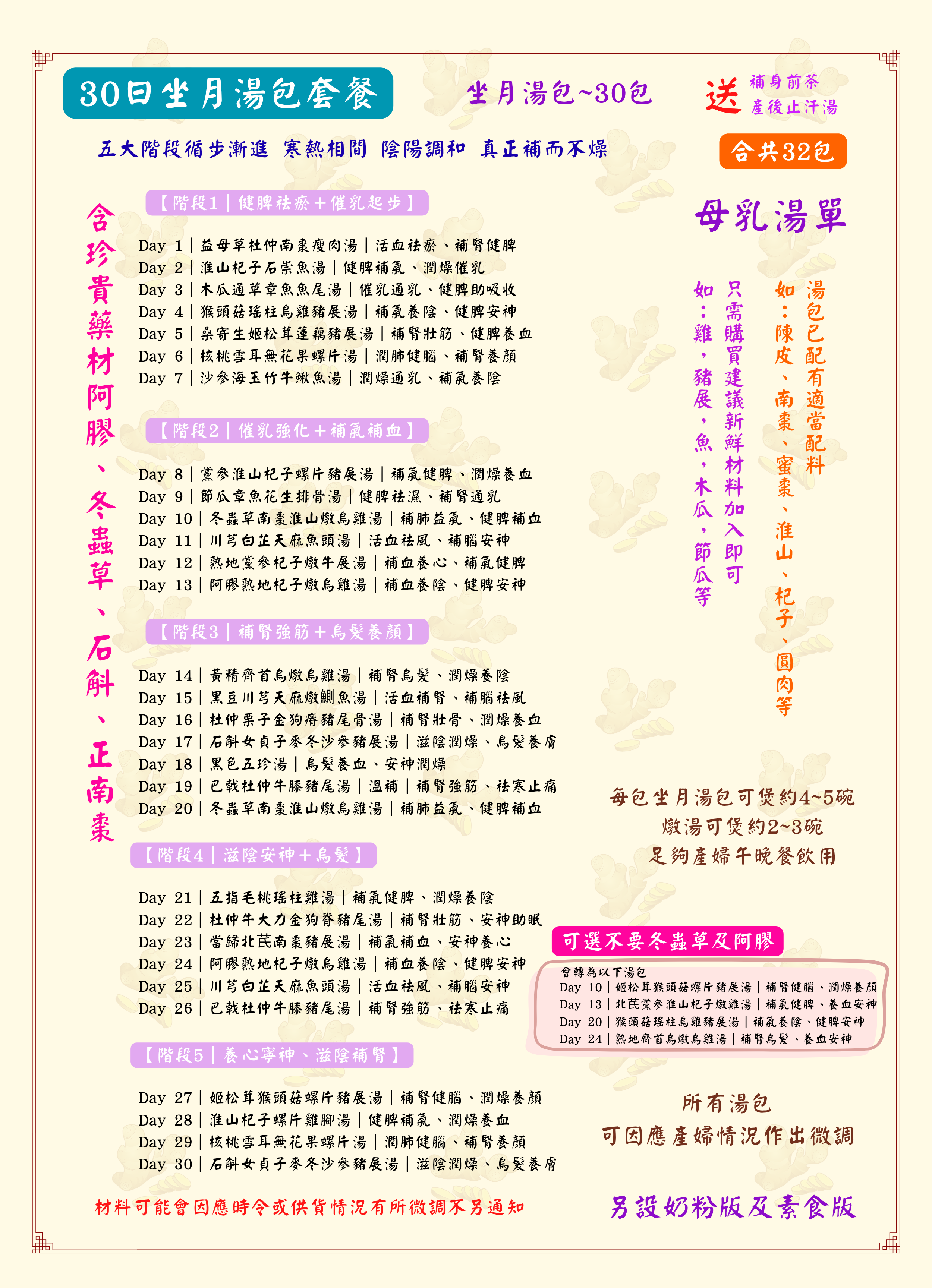 ✅ 湯包獨立包裝,一次一包,簡單易用✅ 沖涼薑包小包包裝✅ 所有產品附詳細使用方法,無需經驗都煲得好✅ 精選醫藥級藥材,包含冬蟲草、阿膠、石斛、南棗、瑤柱、螺片等珍貴材料✅ 不含開刀禁用藥材,順產或開刀都適合✅ 特別適合無陪月媽媽,自己都可以坐好月✅ 標籤中英對照,方便外傭或非華語人士使用