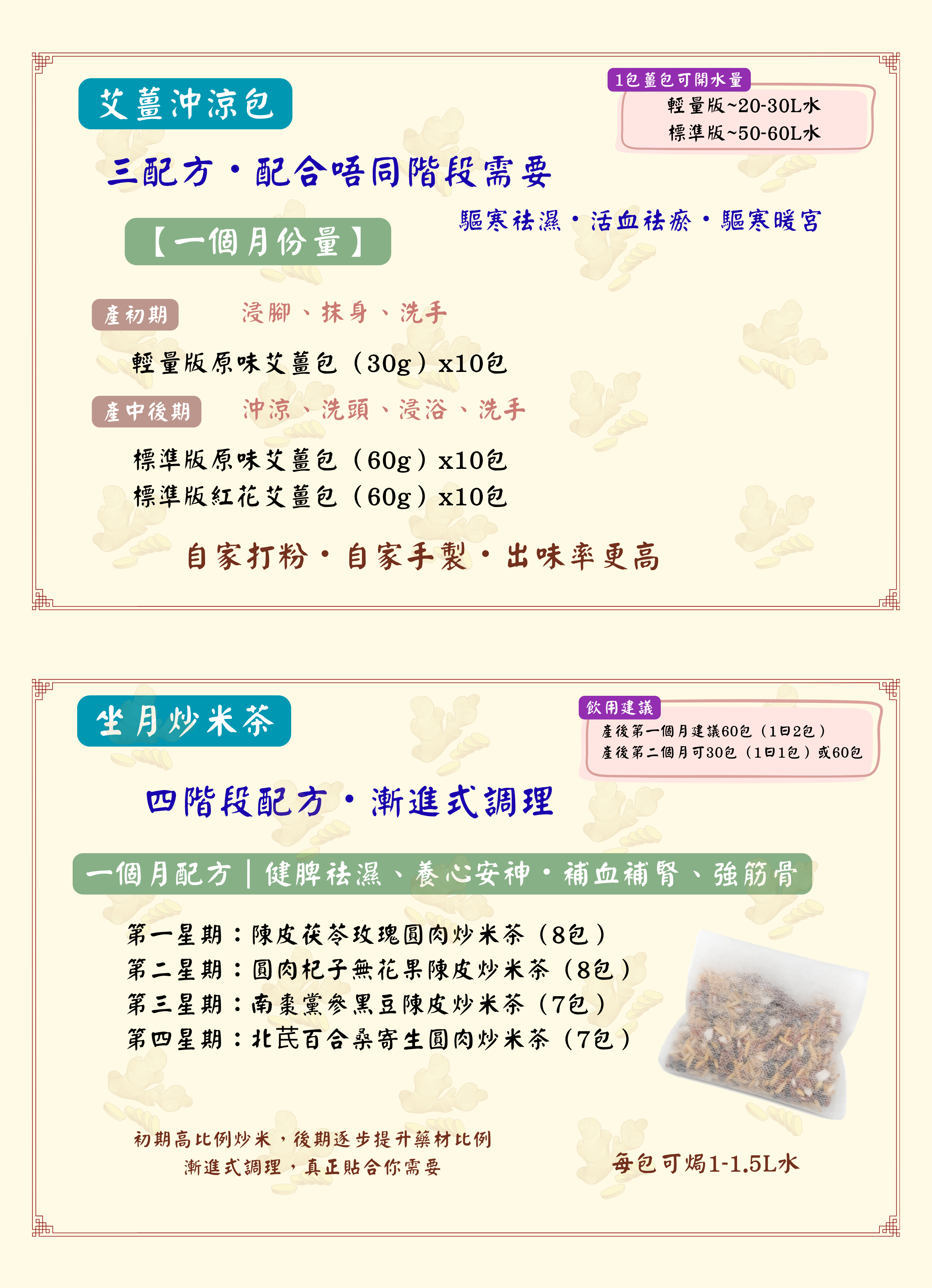 ✅ 一個月份量剛剛好,無需額外補貨✅ 沖涼+飲用雙重調理,內外兼顧✅ 可依個人需求選擇茶包種類與數量✅ 陪月推薦,海外媽媽熱賣中✅ 歡迎訂制 :可根據個人坐月計劃或體質調整更改配方